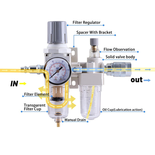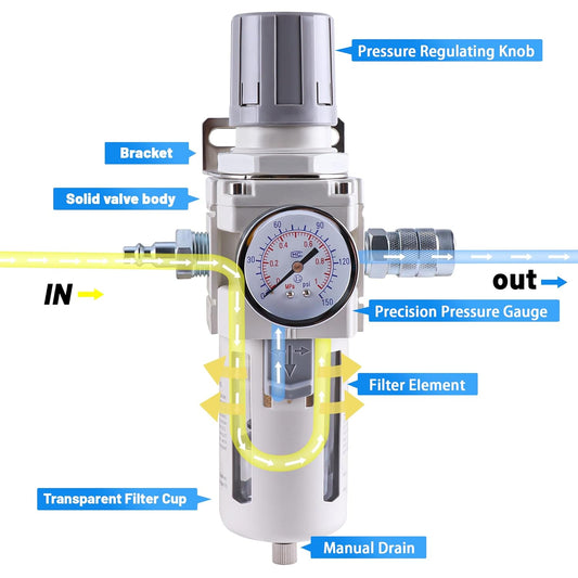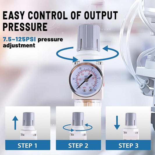 1/4 Inch NPT Air Filter Regulator Combo Piggyback, Air Compressor Water Separator, Air Line Dryer, Semi-Auto Drain, Air Pressure Regulator AW2000-02, 0-150 PSI Gauge