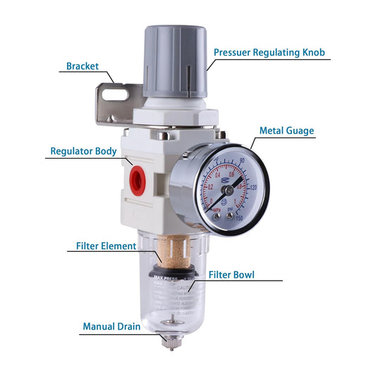 1/4 Inch NPT Air Filter Regulator Combo, Air Compressor Water Oil Separator, Air Line Dryer, Manual Drain, Air Pressure Regulator AW2000-02, 0-150 PSI Gauge