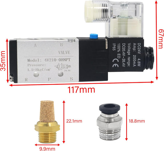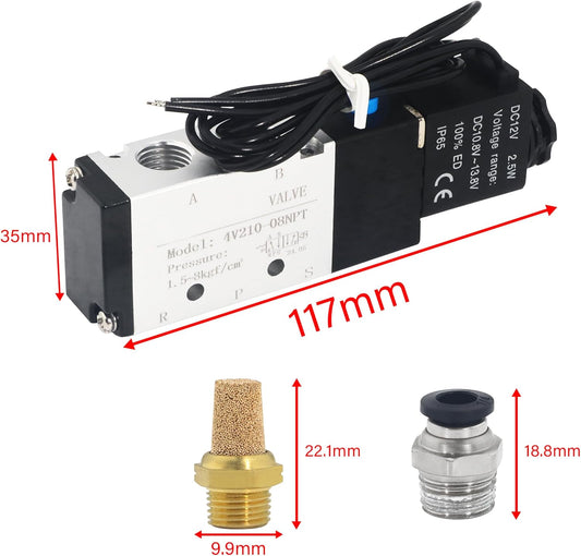 1/4 Inch NPT Solenoid Valve, 4v210-08 DC 12V Single Coil Pilot-Operated, 2 Position 5 Way Connection Outlet Wire, with 3 Fittings, 2 Silencers, and 1 Tape