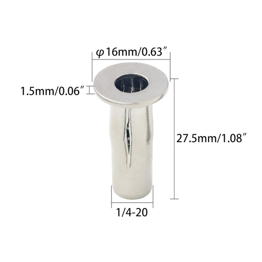 1/4in-20×27.5mm Multi-Grip Rivet Nuts, 6pcs Pre-Bulbed Shank Flat Head Threaded Insert Nut 304 Stainless Steel Plus Nuts for Construction Industrial
